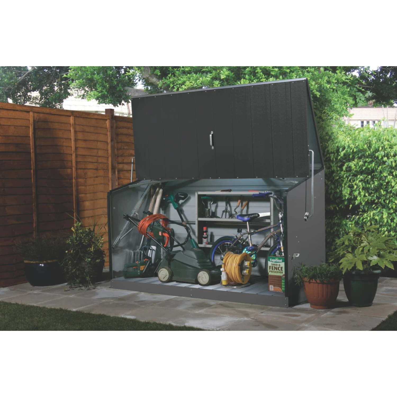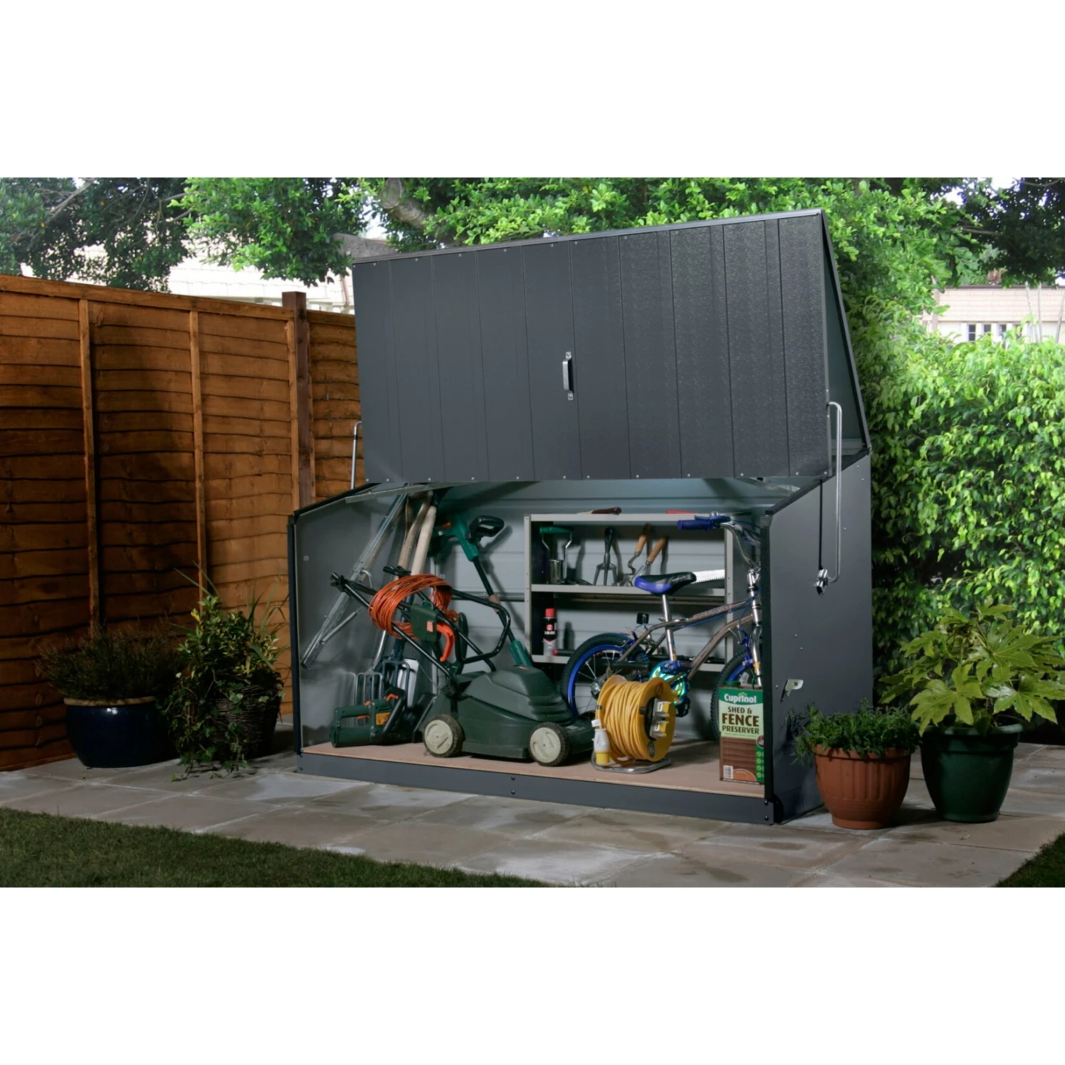 Die Trimetals Aufbauwahrungs- und Fahrradboxen verfügen über ein einzigartiges, patentiertes Design, das speziell für die sichere und effiziente Lagerung von Fahrrädern und Gartengeräten entwickelt wurde.
